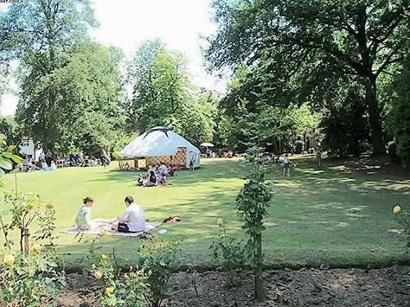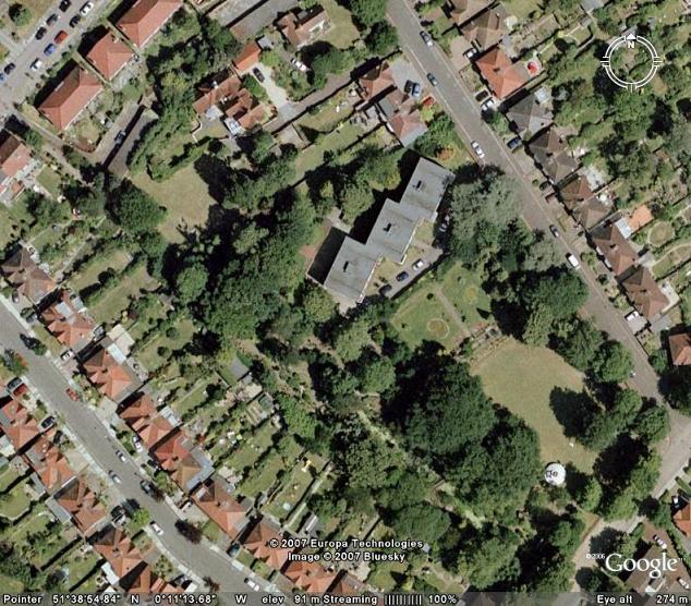 And as a comparison, here is a picture taken from Google Earth of Highlands Gardens on the day of our summer picnic in 2006. We can date it exactly, as the round yurt has been erected at the southern end of the Gardens. The three roofs of Highlands flats are very visible. The flats occupy the site of the old house.